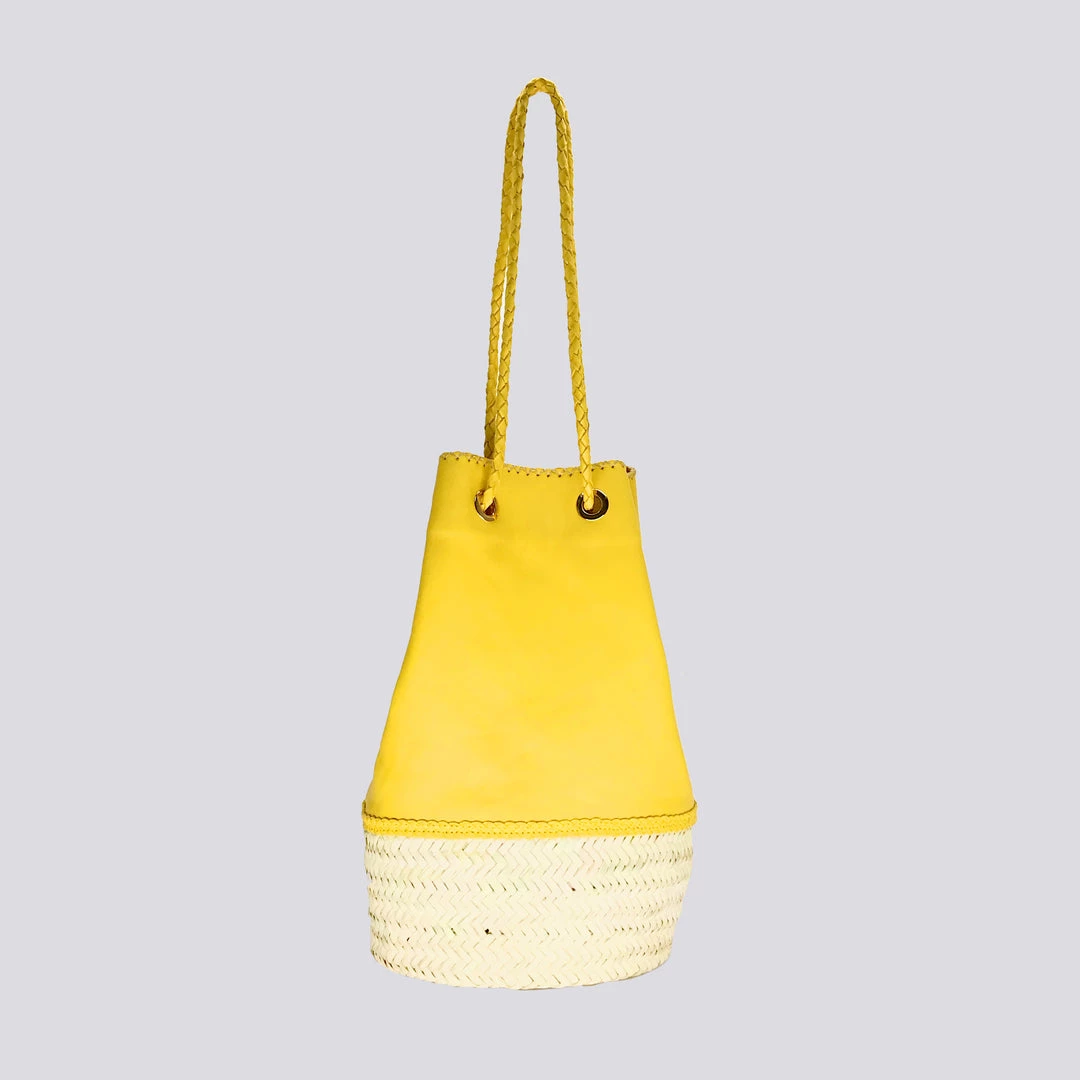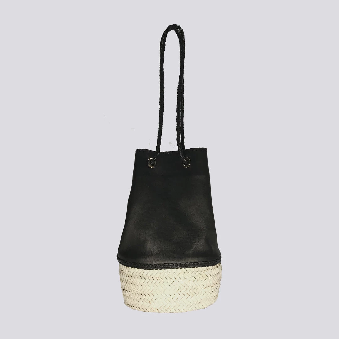 Mira Cuir, imagined in Paris, inspired by and crafted in Morocco. This bucket leather bag with a hand-braided palm bottom is chic and colorful.