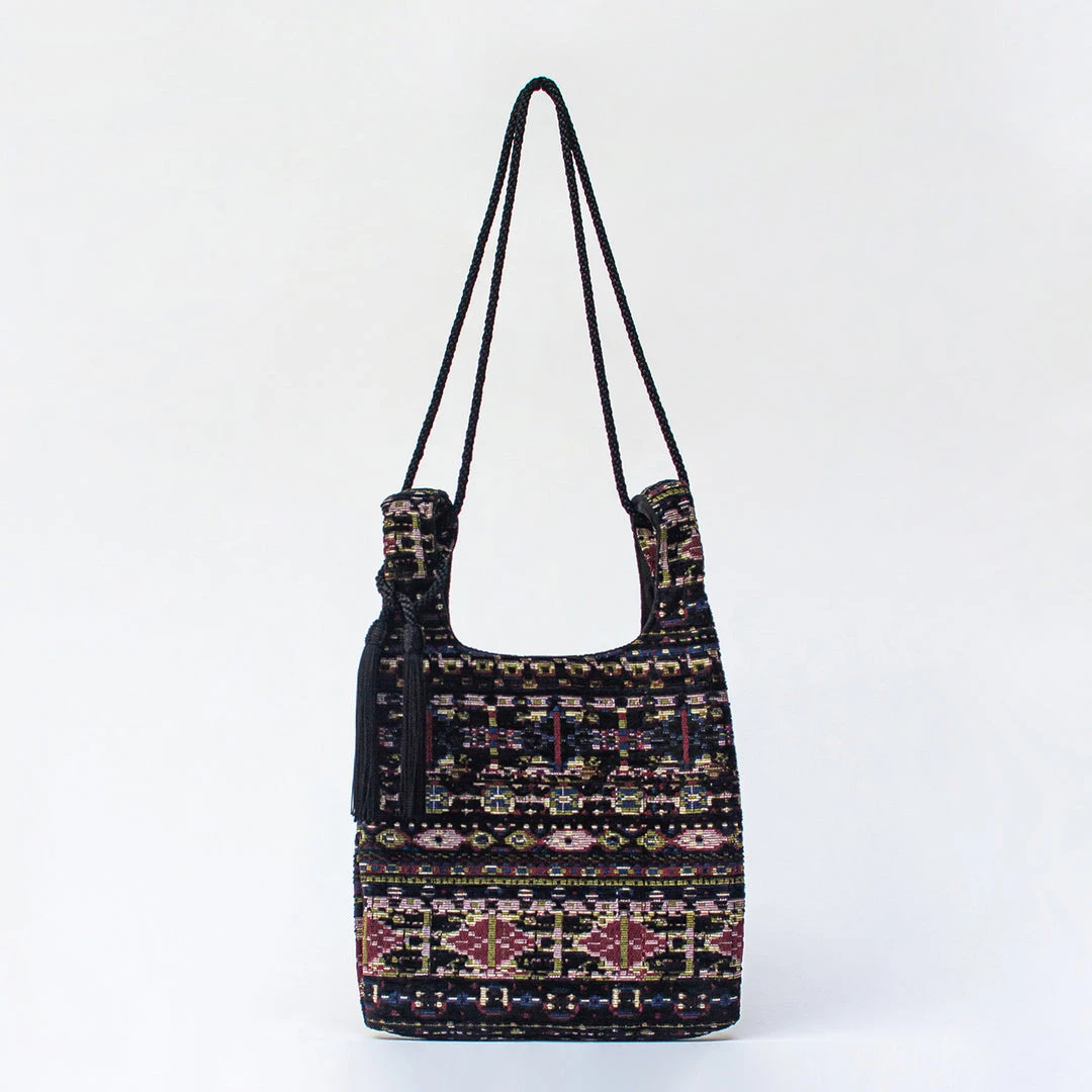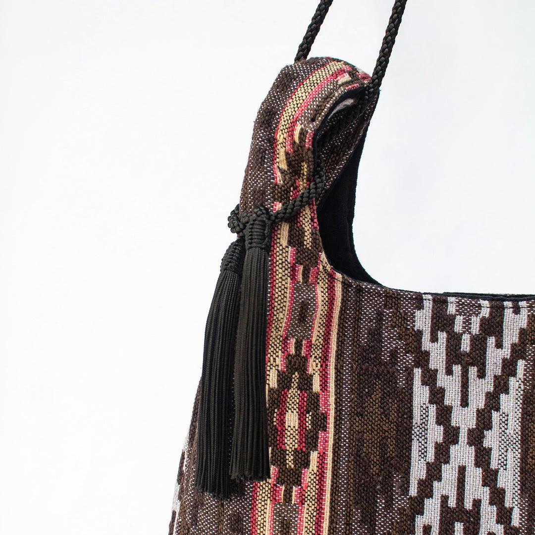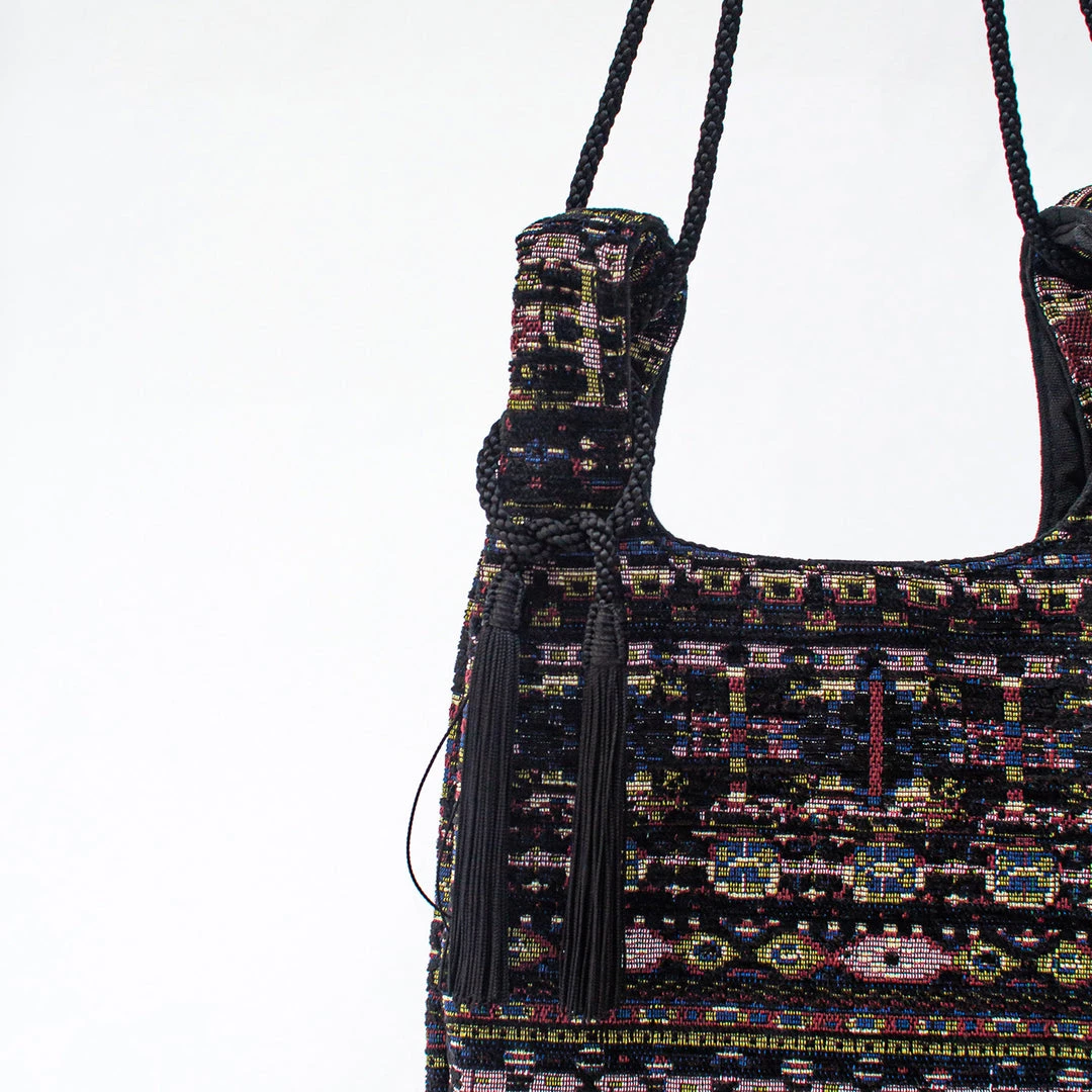The Kolkata bag is our jacquard bag inspired by the colourful atmosphere of the eponymous Indian city. We have designed 4 creative patterns for this medium sized bag and you can collect them all: Tipi, Flore, Bohem and Navajo. This bag has a black lining and magnet button. The handle with the pompoms is made in the sabra way, traditionally used in Morocco. This bag is a marriage of the two countries that we love for their craftsmanship skills!