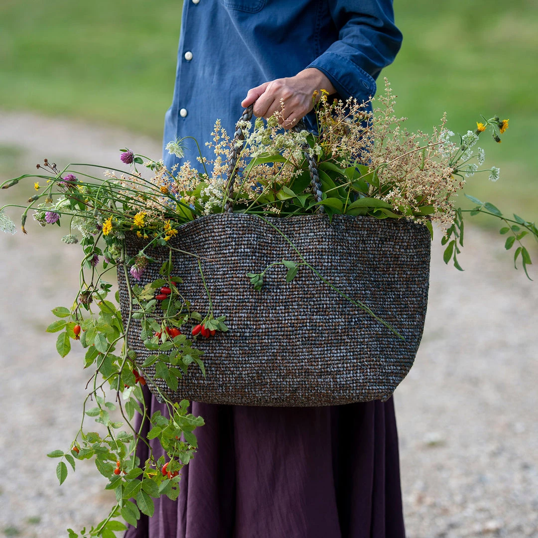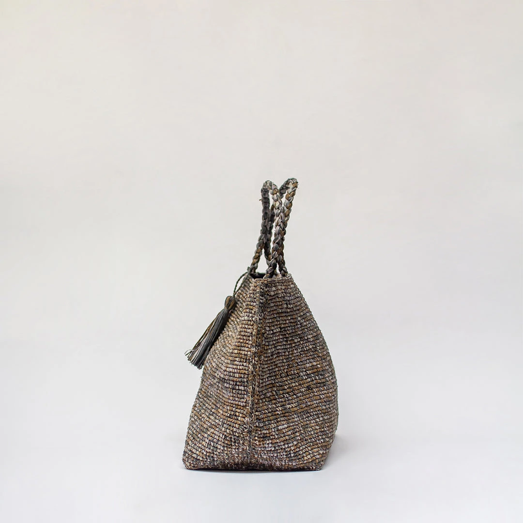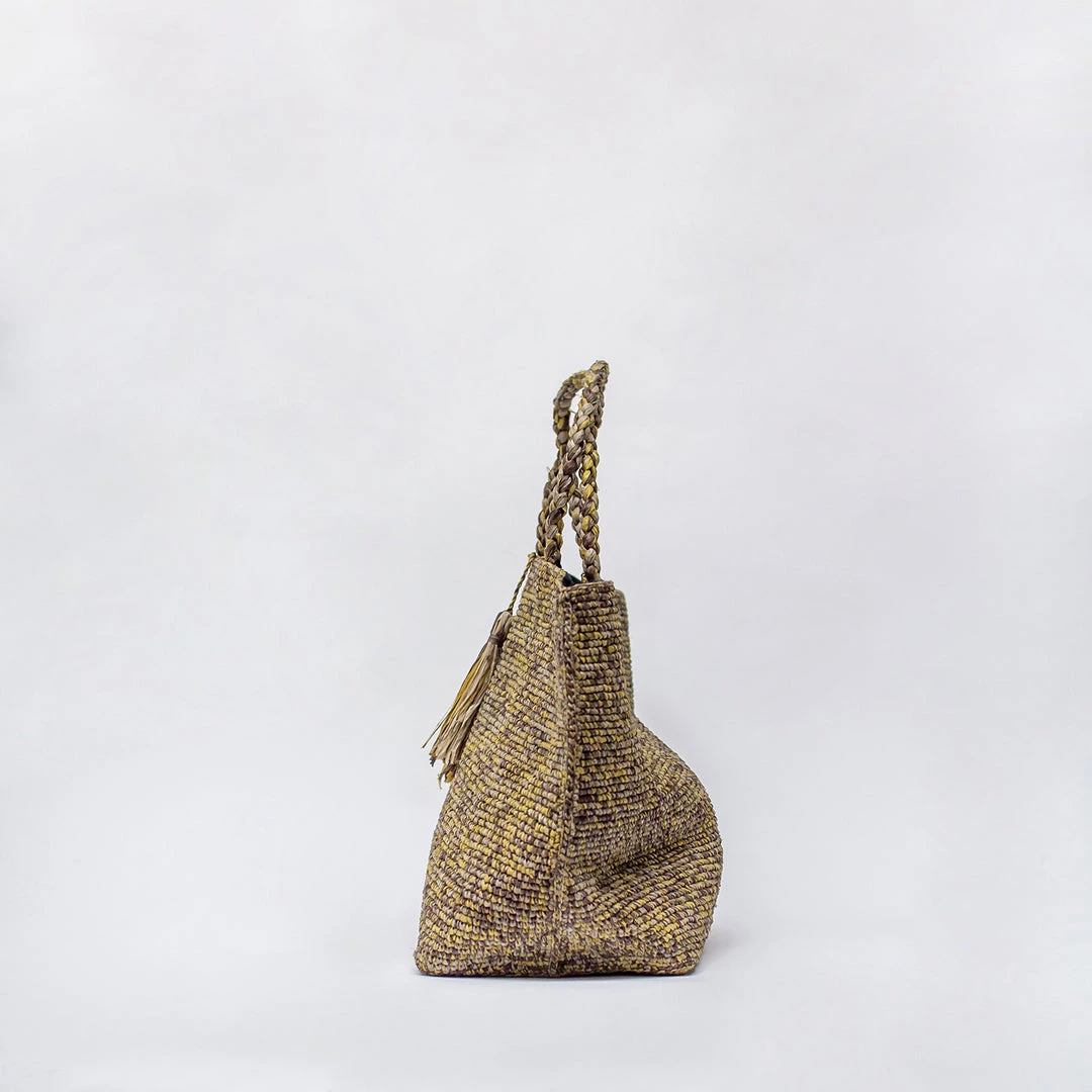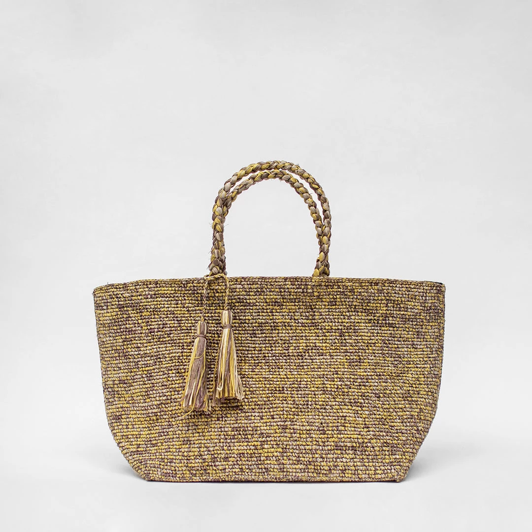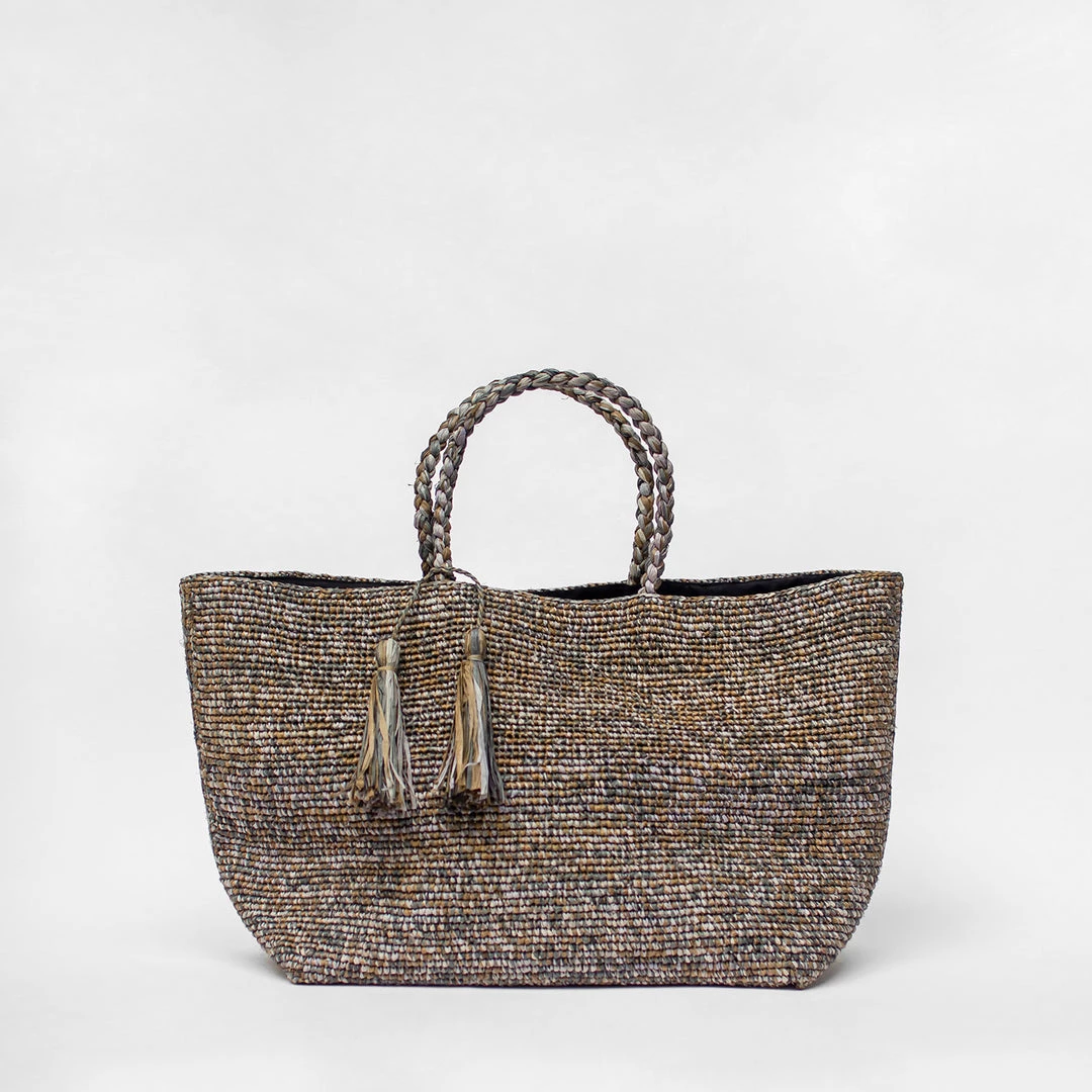 The Rose Marie Chiné Grand was born from our idea of blending together different colored leaves of raffia which represent for us the Autumn colors: brown and light brown, pastel blue, grey and canary. Our creativity is limitless and that the mastery of the art of crochet in Madagascar can result in unique and raffinate creations. Our Rose Marie Chiné bags will look exquisite in a natural and urban environment as the perfect addition to all your Autumn outfits. The Rose Marie Chiné Grand is spacious enough to carry inside your laptop for work. This bag has a black cotton lining to make it more resilient to the Autumn rainy days.