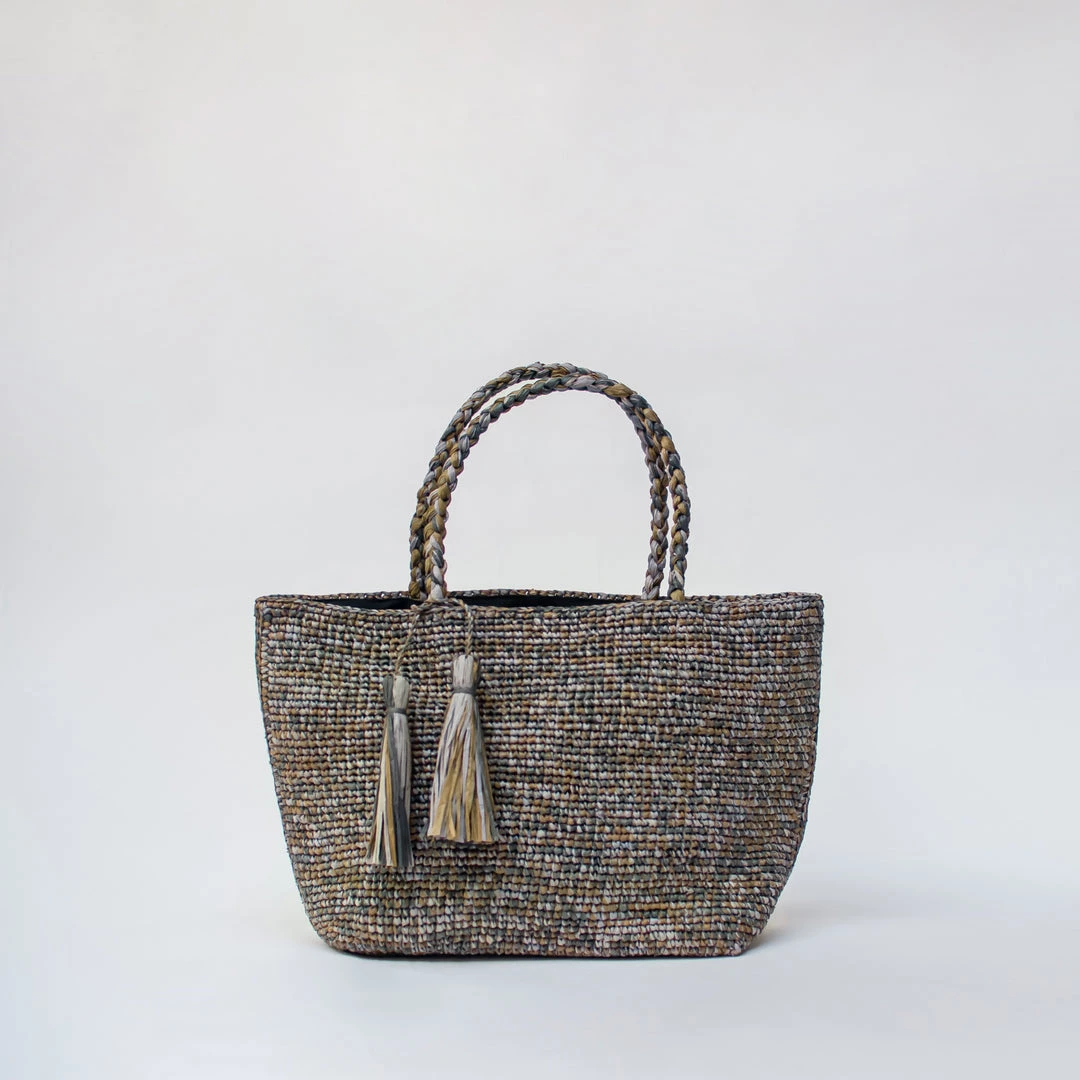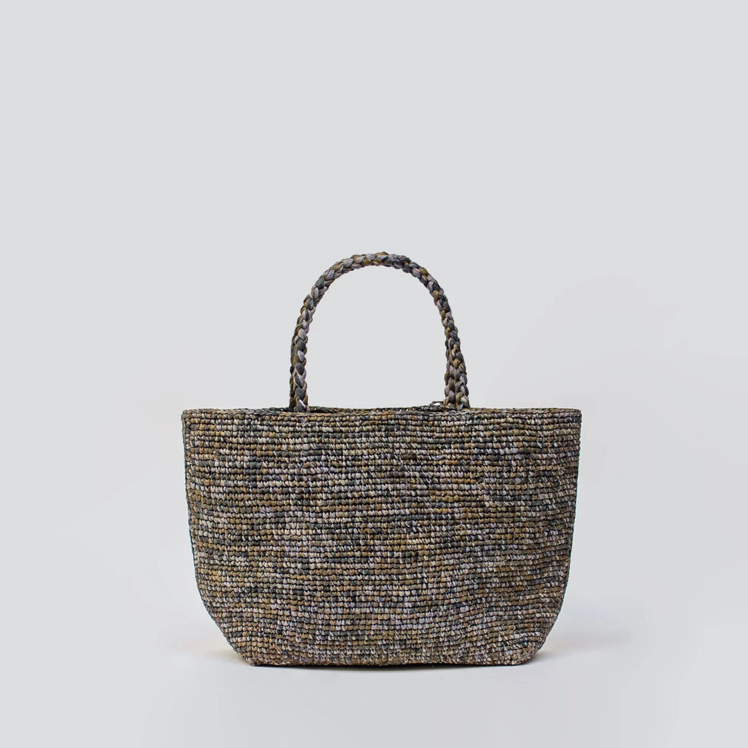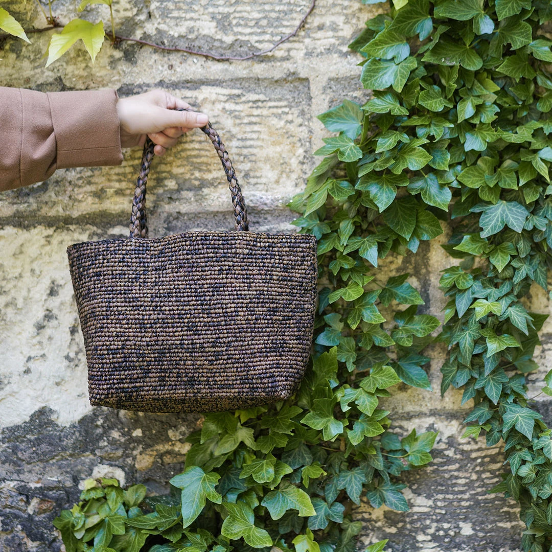 The Rose Marie Chiné Petit was born from our idea of blending together different colored leaves of raffia which represent for us the Autumn colors: brown and light brown, pastel blue, grey and canary. Our creativity is limitless and that the mastery of the art of crochet in Madagascar can result in unique and raffinate creations. Our Rose Marie Chiné bags will look exquisite in a natural and urban environment as the perfect addition to all your Autumn outfits. The small size of Rose Marie Chiné Petit will make you look so cute and elegant. This bag has a black cotton lining to make it more resilient to the Autumn rainy days.