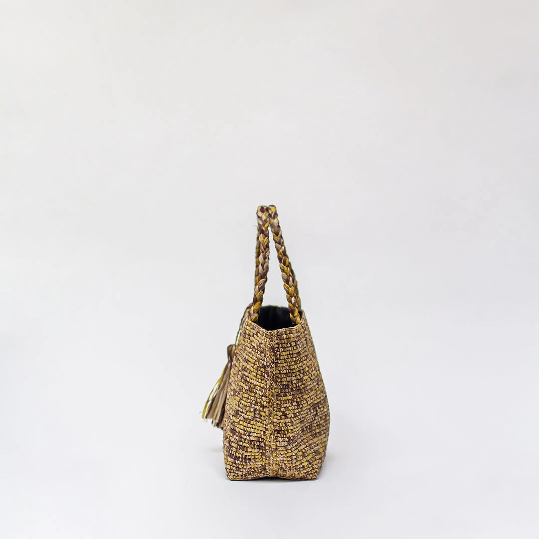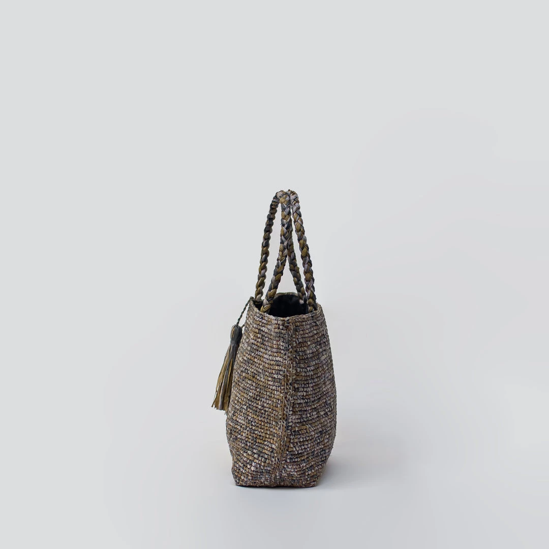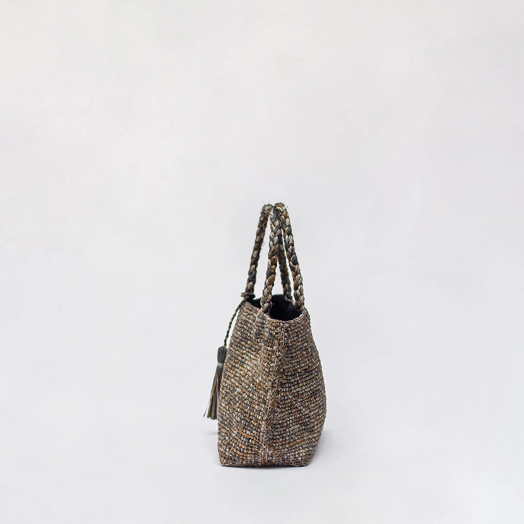 The Rose Marie Chiné Petit was born from our idea of blending together different colored leaves of raffia which represent for us the Autumn colors: brown and light brown, pastel blue, grey and canary. Our creativity is limitless and that the mastery of the art of crochet in Madagascar can result in unique and raffinate creations. Our Rose Marie Chiné bags will look exquisite in a natural and urban environment as the perfect addition to all your Autumn outfits. The small size of Rose Marie Chiné Petit will make you look so cute and elegant. This bag has a black cotton lining to make it more resilient to the Autumn rainy days.